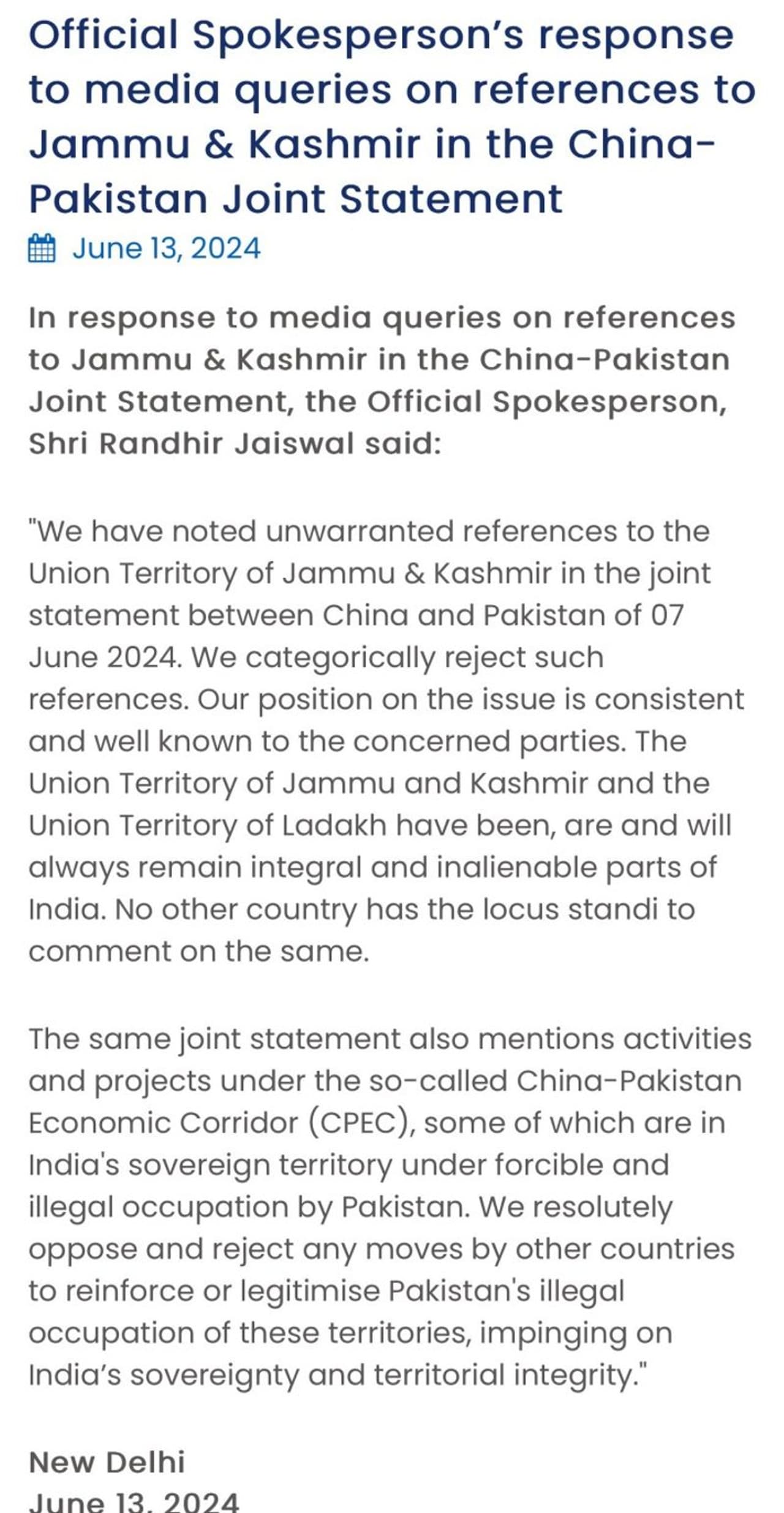 "We have noted unwarranted references to the Union Territory of Jammu and Kashmir in the joint statement between China and Pakistan of 07 June 2024. We categorically reject such references," said Jaiswal.