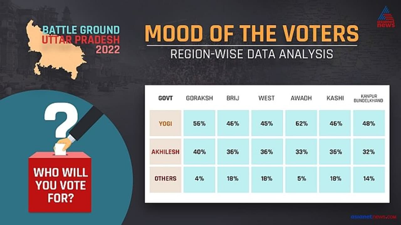 A closer look at the data emerging from the Asianet News Mood of the Voters survey indicates Yogi's popularity soars in the Awadh region (62%) and the Goraksh region (56%), which includes his Gorakhpur constituency.