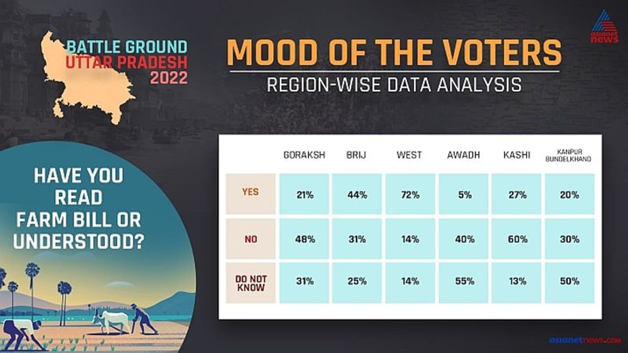 Awadh region: In the survey, 64 per cent of the people said that they do not know whether the new laws are good or bad. Only 28 per cent said that agriculture laws are good. At the same time, 8 per cent said that the agriculture bill is bad. About 55 per cent of the people here don't know anything about the agriculture bill. While 40 per cent did not even read the laws, only five per cent of the people here have read and understood the legislation.