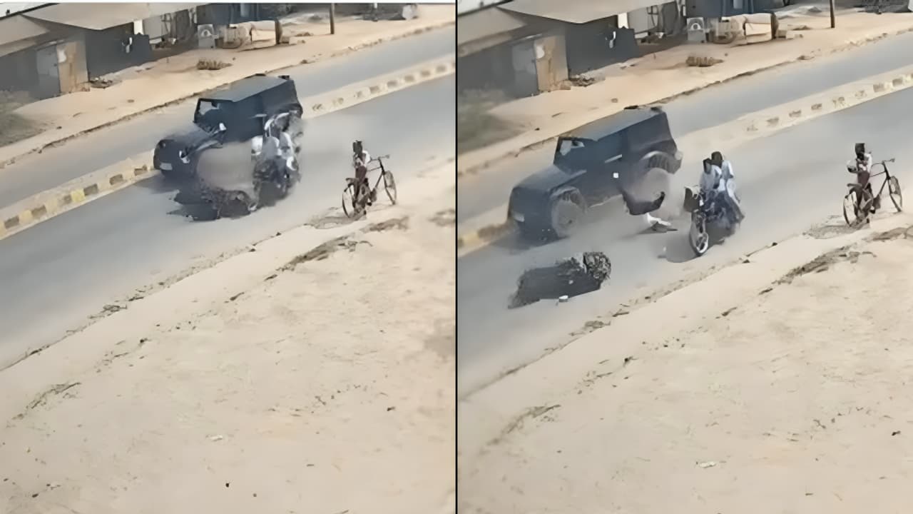 CCTV footage of a dangerous road accident in Kusaura Bazaar in Uttar Pradesh’s Basti district has gone viral online. The video shows a speeding Mahindra Thar SUV crashing into a motorcycle and throwing the biker onto the road.