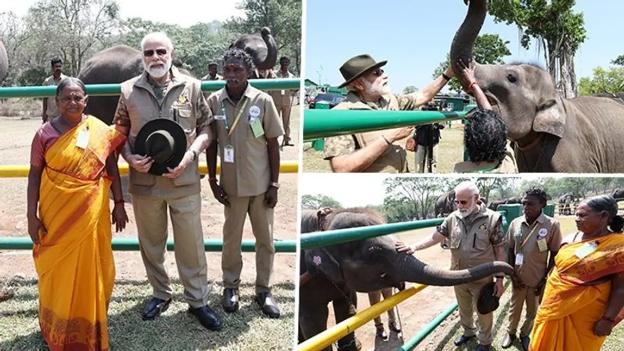 Prime Minister Narendra Modi on Sunday met the Bomman and Bellie couple, stars of the Oscar-winning documentary The Elephant Whisperers. PM Modi was seen interacting with the couple and elephants - Raghu and Ammu. The Elephant Whisperers bagged Oscars for Documentary Short Film at the 95th Academy Awards. In addition to interacting with the couple, Prime Minister Narendra Modi is also seen standing beside the elephants, gently caressing the gentle giants Bommi and Raghu with affection.