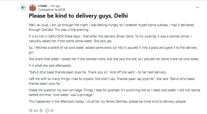 A conversation on empathy and daily privilege has been triggered by a man's encounter with a food delivery rider during the intense heatwave that Delhi-NCR has been experiencing for the past few days. The Reddit post's subject stated, "Please be kind to delivery guys, Delhi." The man said that all started when he ordered something from Subway via Zomato. He was shocked to see a female rider navigating in the sweltering heat when the delivery arrived.