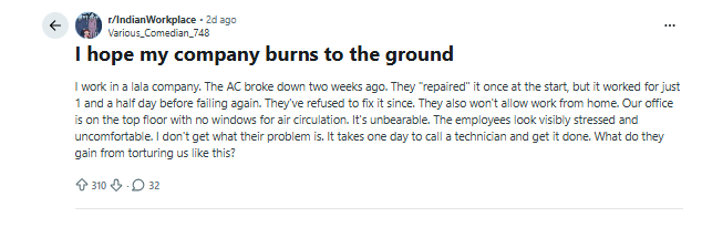 A viral Reddit post highlights an employee's distress over being forced to work in a top-floor office without air conditioning or windows. Despite the AC being broken for two weeks and employees being visibly stressed, the company refuses to repair it or allow work from home.