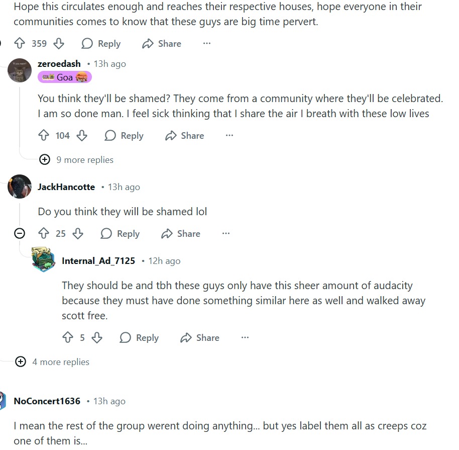 One comment asked whether the group could instead be from Pakistan, Bangladesh, or Sri Lanka, pointing out that not every brown-skinned person is from India. This led to further discussion about racial profiling and unfair generalisation based on appearance alone.