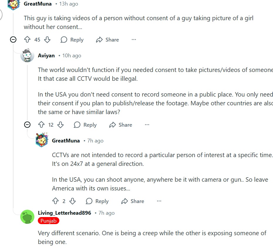 Some users questioned whether the person recording the video was also violating consent by filming another man without permission. In response, others argued that exposing alleged inappropriate behaviour is different from secretly filming someone for personal gratification.