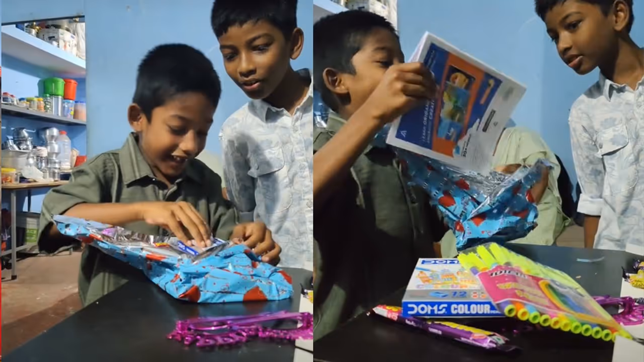 After a cute video of a little child receiving a birthday gift basket went viral, the internet was reminded that sometimes the tiniest things can provide the most happiness. Reel maker Nehal posted the video along with the straightforward query, "Why did we stop living like this?" At the time of the recording, the kid, Vavachy, her cousin, had just turned five. He enthusiastically tore open the wrapping paper to find the hamper full of colourful treats, including a notepad, chocolates, a brand-new set of crayons, and brilliant sketch pens.