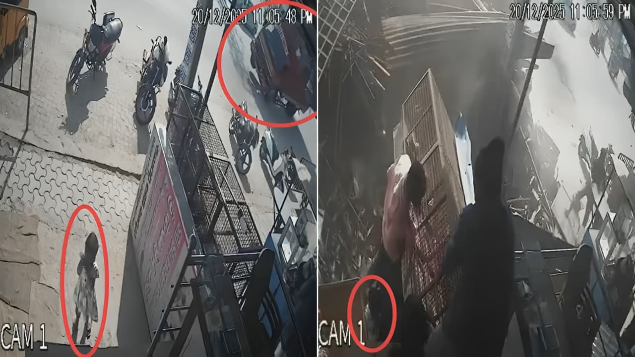 A CCTV video from Telangana shows an overloaded DCM truck overturning on Hyderabad-Bijapur highway in Vikarabad. The truck toppled during a sharp turn, trapping a child under a metal rack. Quick action by locals saved the child, who appeared unharmed