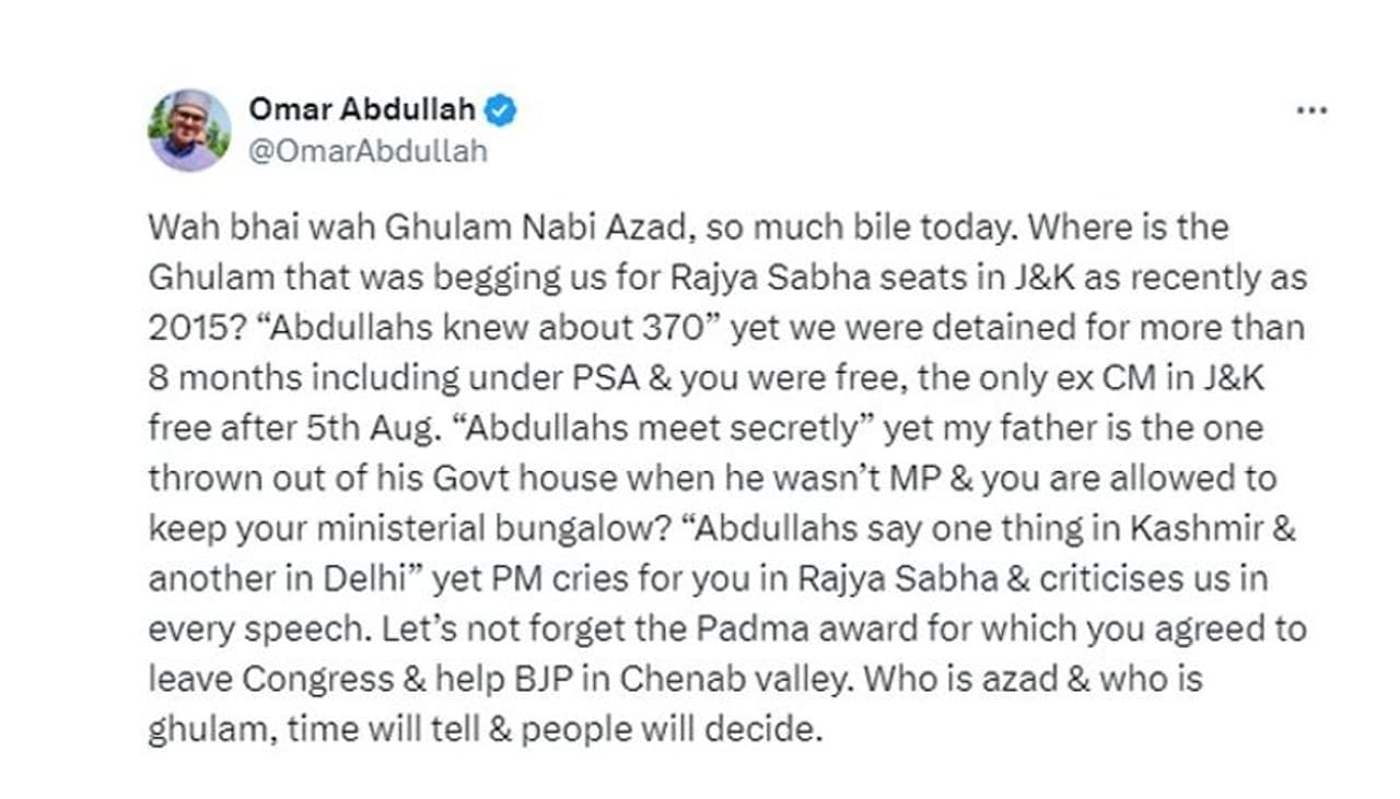 Omar responded to Azad's accusations on social media, writing: "Where is the Ghulam who was pleading with us for J&K Rajya Sabha seats as recently as 2015?""