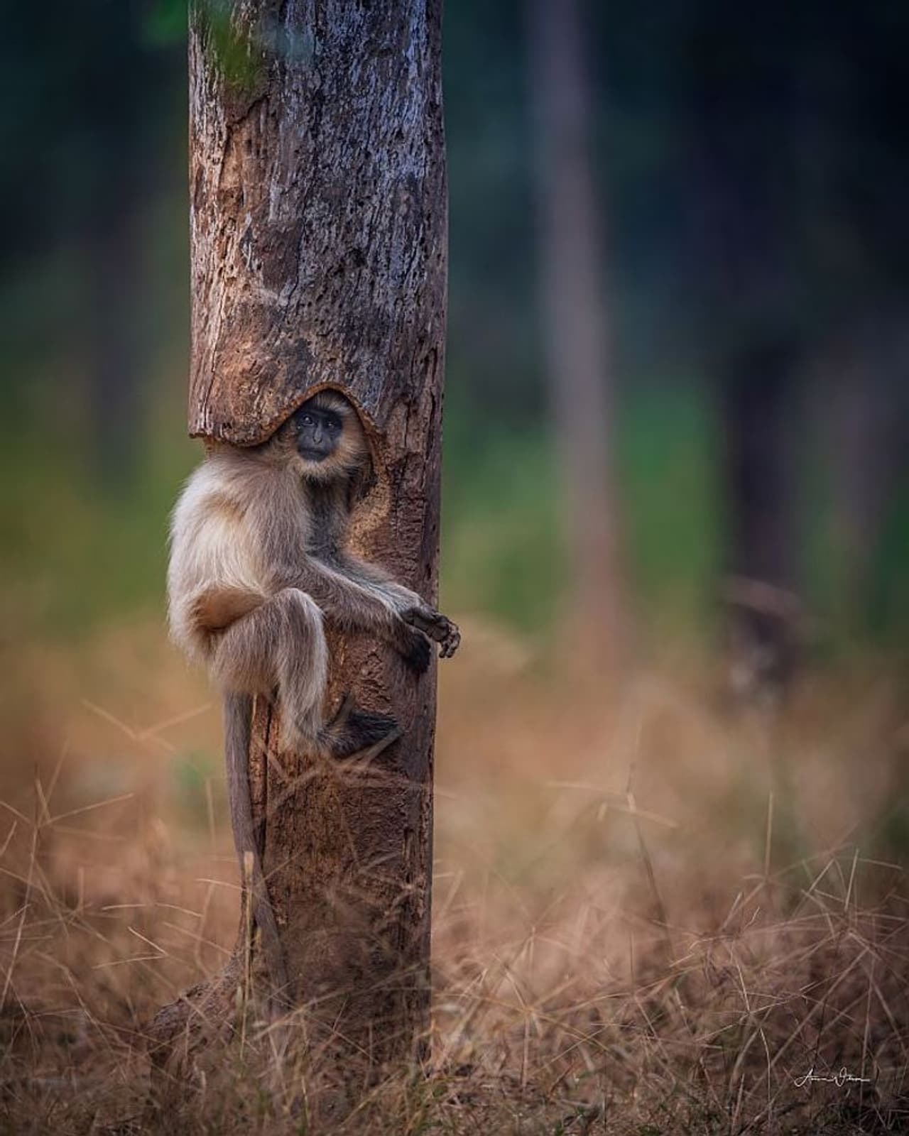 "One of the langurs moved to a separate tree which had a cut-out right in the middle and it was hollow too. The langur climbed up and sat in the very same spot as if it was his space. He just fit right and was absolutely comfortable. I kept on shooting and it kind of changed my frown upside down. That's how I was able to create such a unique shot."