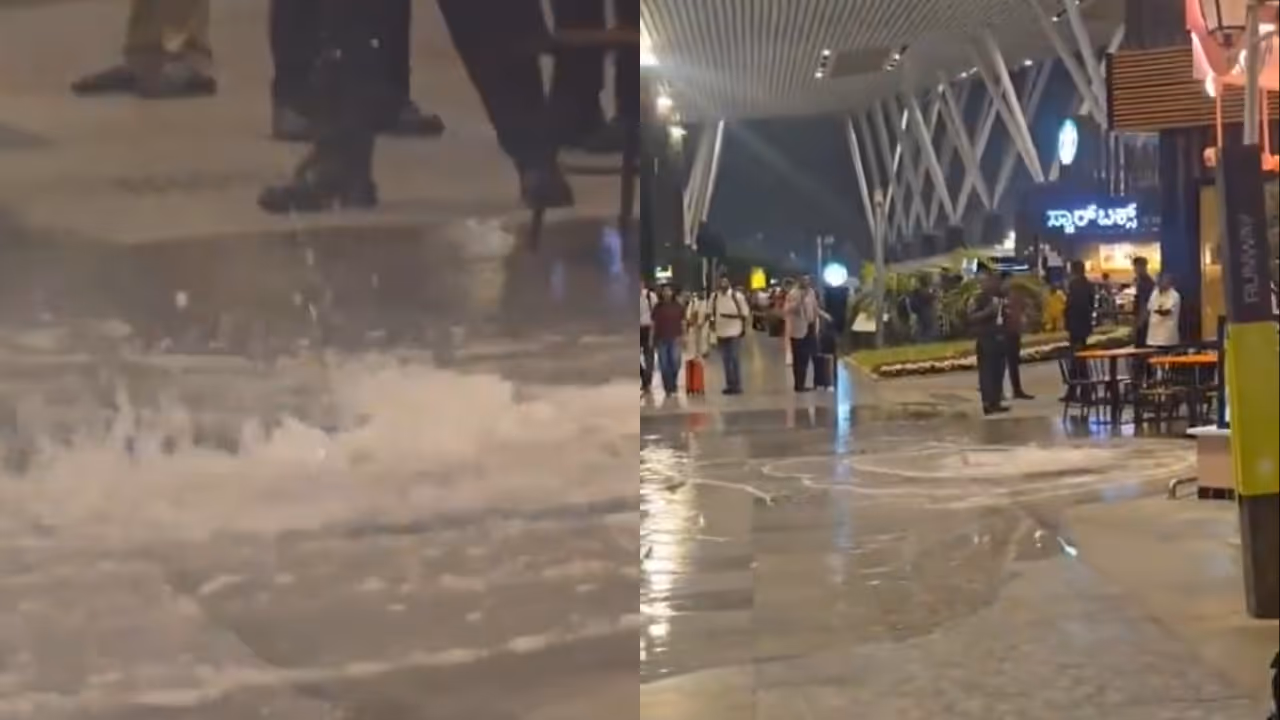 Heavy rain at Bengaluru’s Kempegowda International Airport turned parts of the terminal into a ‘mini waterfall,’ causing waterlogging and flight disruptions. Social media videos went viral, raising concerns about airport infrastructure and drainage systems.
