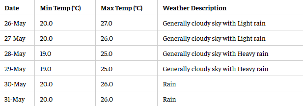 According to the IMD, the city will experience cloudy skies and frequent rainfall in the coming days. Light rain is expected on May 26 and 27, with temperatures ranging from 20°C to 27°C. Heavier downpours are predicted on May 28 and 29, when the minimum temperature may dip to around 19°C. Rain is also likely on May 30 and 31, with temperatures hovering between 20°C and 26°C.