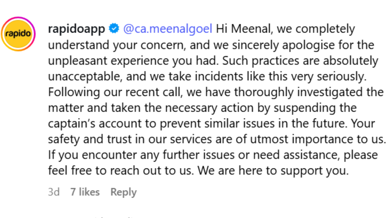 Responding to the viral post, Rapido said it had taken the matter seriously. "Hi Meenal, we completely understand your concern, and we sincerely apologise for the unpleasant experience you had. Such practices are absolutely unacceptable, and we take incidents like this very seriously. Following our recent call, we have thoroughly investigated the matter and taken the necessary action by suspending the captain's account to prevent similar issues in the future. Your safety and trust in our services are of utmost importance to us. If you encounter any further issues or need assistance, please feel free to reach out to us. We are here to support you," the company said in a statement.