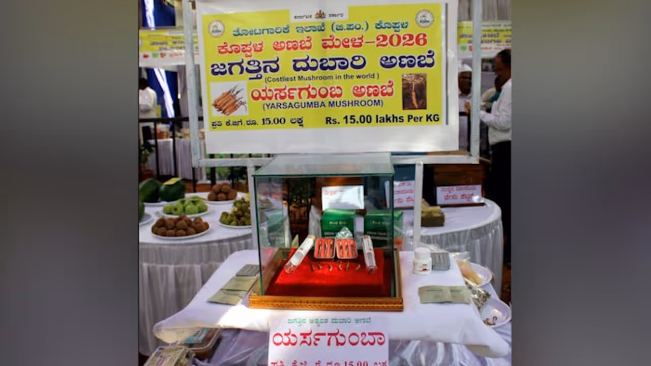 A rare and astonishing fungus known as Yarsagumba — labelled the world’s most expensive mushroom — drew crowds recently at a fruit and vegetable exhibition in the Koppal district of Karnataka. Displayed at the horticulture department’s fair in the city, this exotic specimen was priced at an eye-watering ₹15 lakh per kilogram, making it a spectacle for visitors and media alike.