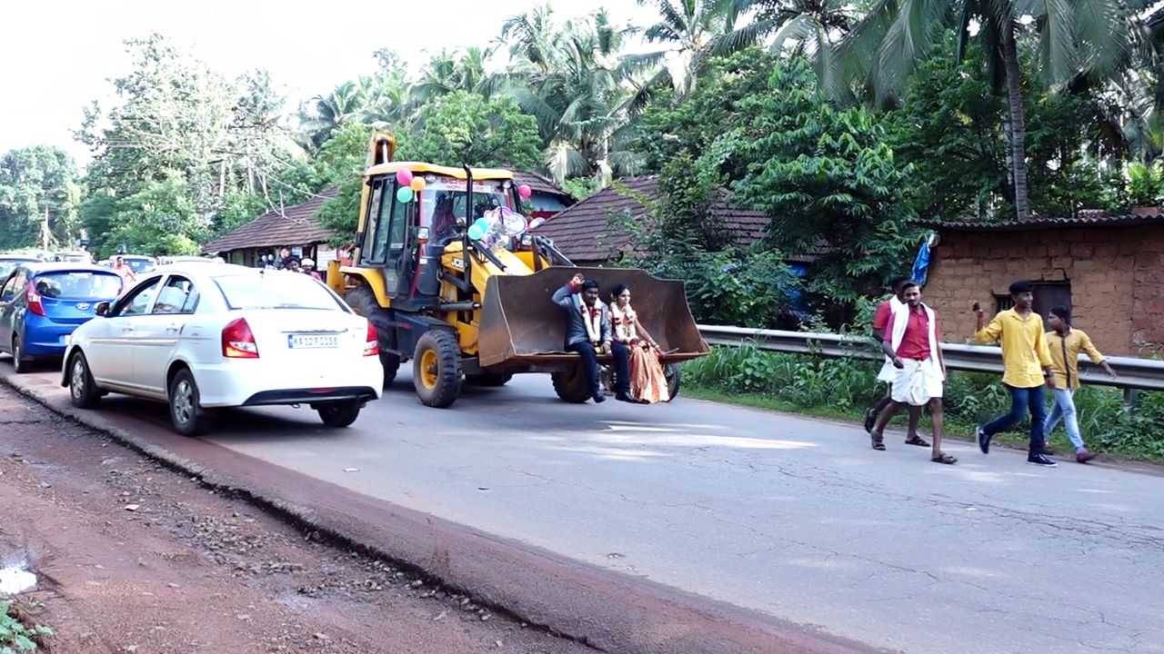 An amusing incident transpired in Puttur city of Dakshina Kannada district, Karnataka, where a groom took the wedding procession in a unique style. The groom, Chetan, who works as a back-end (JCB) operator, preferred to take his wedding procession on a JCB.