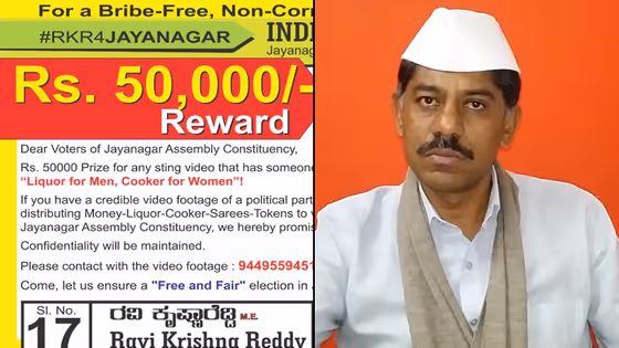 Independent candidate from Jayanagar assembly segment, Ravi Krishna Reddy has given an offer of Rs 50,000 cash as a reward for those who expose rivals like BJP, Congress and JDS. The handbills designed by the candidate and his supporters state that whoever records the distribution of cash, cookware, sarees and other items to influence voters will be given a cash reward of Rs 50,000 and their confidentiality will also be guarded.