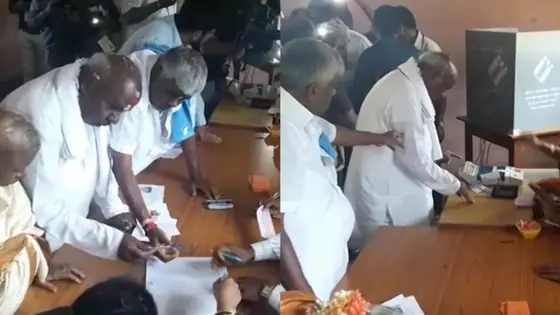 JD(S) Supremo, former PM Deve Gowda caasts his vote in Hassan. He was accompanied by wife, son, son-in-law and grandson. Watch video here