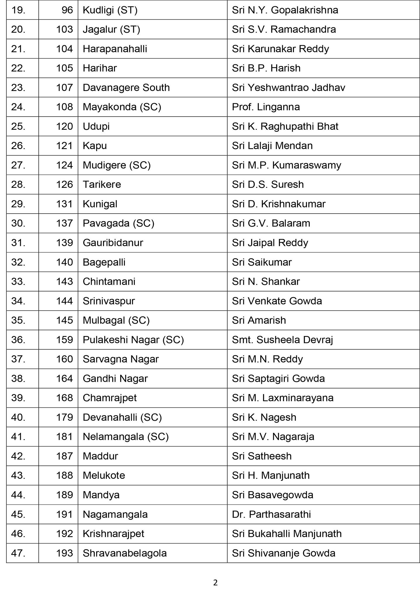Actor Saikumar has been given a ticket from Bagepalli and former speaker KG Bopaiah from Virajpet. However, it is speculated that MP Shobha Karandlaje will be given ticket from Yeshwantpur. However, the party has kept the spot waiting for 11 constituencies.