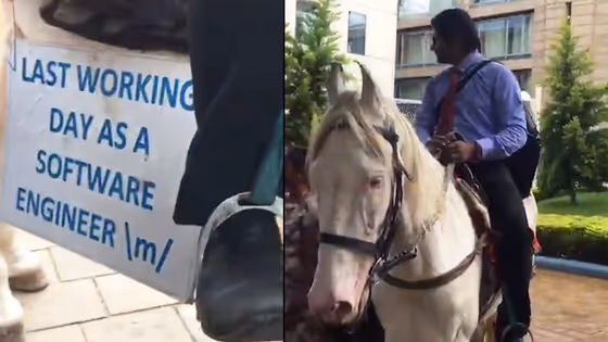 Roopesh Kumar Verma, a software engineer rode a horse to his office on his last day of working at the Embassy Golf Links (EGL) campus on Intermediate Ring Road in Bengaluru, recently. The pictures and vidoes of this man riding a horse to his office went viral on social media. This techie also mounted a placard to the horse saying "Last working day as a software engineer". Watch this video on Asianet Newsable to know more in detail.