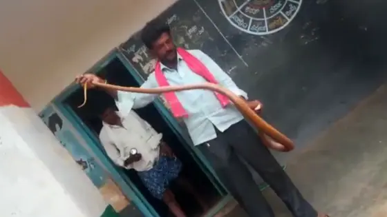 A snake sneaked inside the government school at Kavanapur in Ramanagar taluk and was hiding inside a cupboard. The next morning students were shocked to find the snake inside the cupboard when they opened it. The teachers rushed inside the class and later the seven-foot-snake was captured by the snake charmer Aman Khan and was handed over to the Ramanagar forest department staff, Karnataka. The expert said that the snake was a poisonous one. Watch the video here.