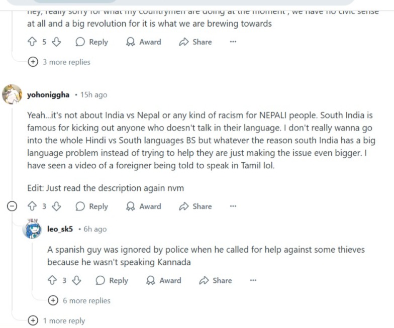 A third user wrote, "Yeah...it's not about India vs Nepal or any kind of racism for NEPALI people. South India is famous for kicking out anyone who doesn't talk in their language. I don't really wanna go into the whole Hindi vs South languages BS but whatever the reason south India has a big language problem instead of trying to help they are just making the issue even bigger. I have seen a video of a foreigner being told to speak in Tamil lol."