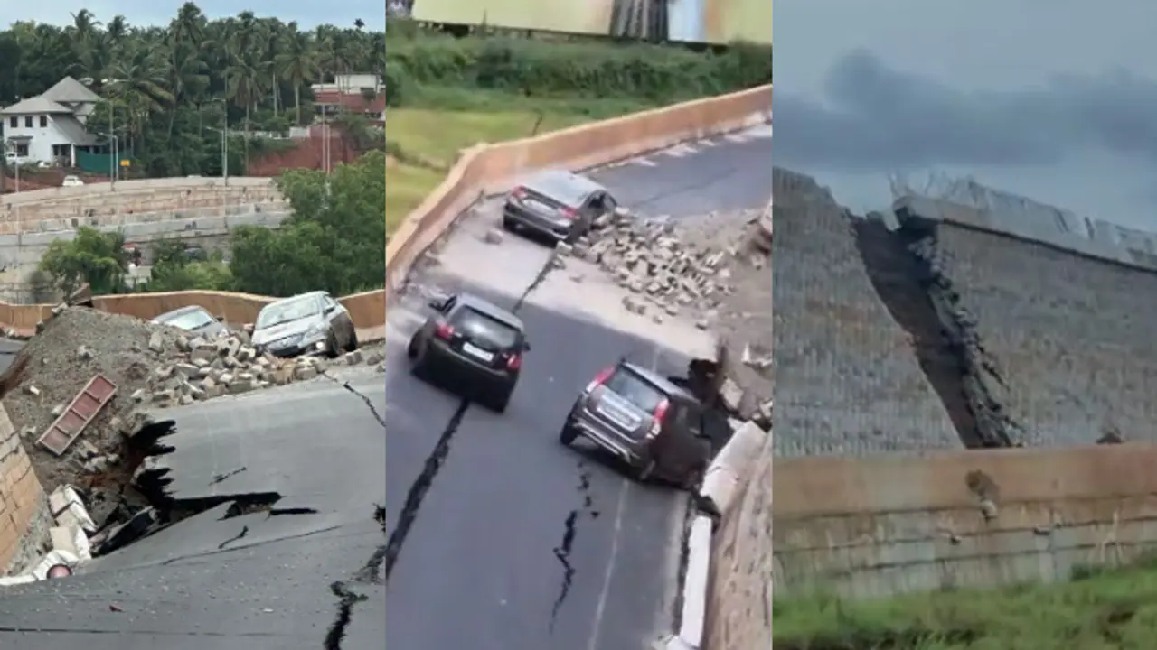 A section of the under-construction six-lane National Highway 66 collapsed onto the service road in Malappuram, Kerala, damaging three cars. No casualties have been reported.