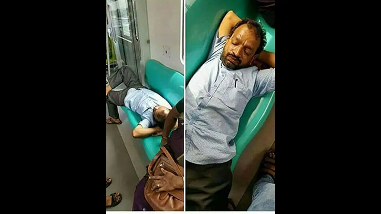 A photo of a man laying down on the seat of Kochi Metro had gone viral on social media with the caption that he is using up the space of at least three passengers. The picture was shared by a Facebook user Manoj Ravindran Niraksharan with a plea to Metro authorities to take action.