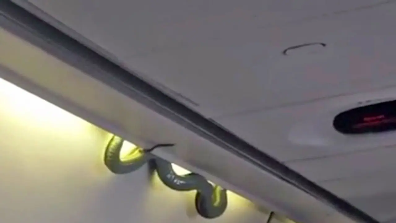 According to a report in The Guardian, “The green reptile emerged suddenly on an Aeromexico flight from Torreon in the country’s north to Mexico City on Sunday, slithering out from behind an overhead luggage compartment.”