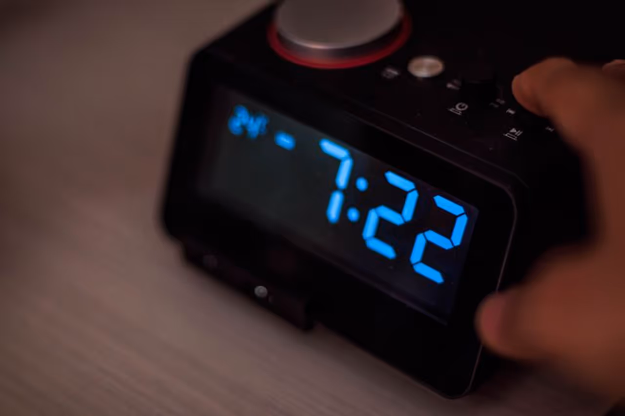 Instead of hitting snooze a bunch of times, set one alarm for the latest time you can wake up. This will encourage you to get up quickly, and if you place the alarm across the room, it gives you an extra reason to get moving.