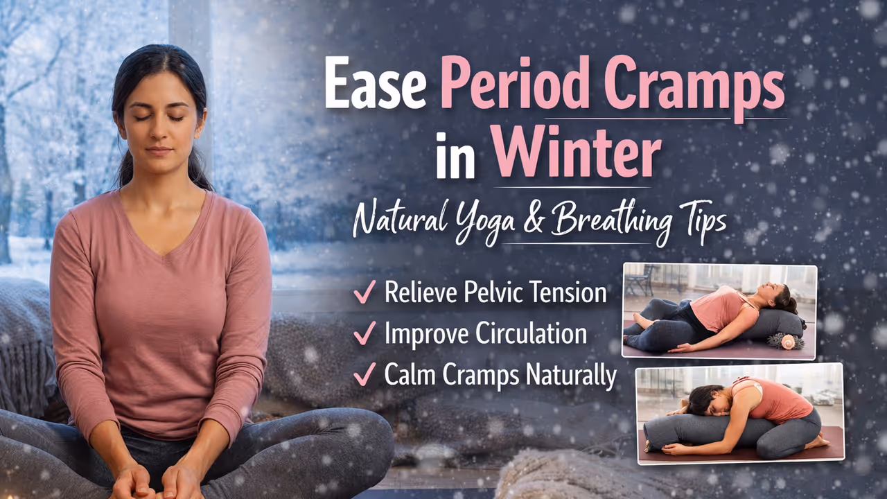 Menstrual cramps can worsen in winter as cold tightens muscles and limits pelvic blood flow. Yoga provides natural relief through gentle poses that relax muscles, improve circulation, and ease lower back and abdominal tension.