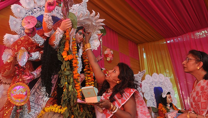 In West Bengal, Durga Puja transforms Kolkata into a city alive with sound, colour, and emotion. Visitors wander through artistic pandals, each telling a different story through elaborate themes, enjoy the traditional bhog, and sway to the rhythm of the dhaak during the dhunuchi dance. Goddess's ‘Bondhon’ starts on Saptami, the 7th day of Sharad Navratri and puja goes on till Dashami also known as Vijaya Dashami in Bengal.