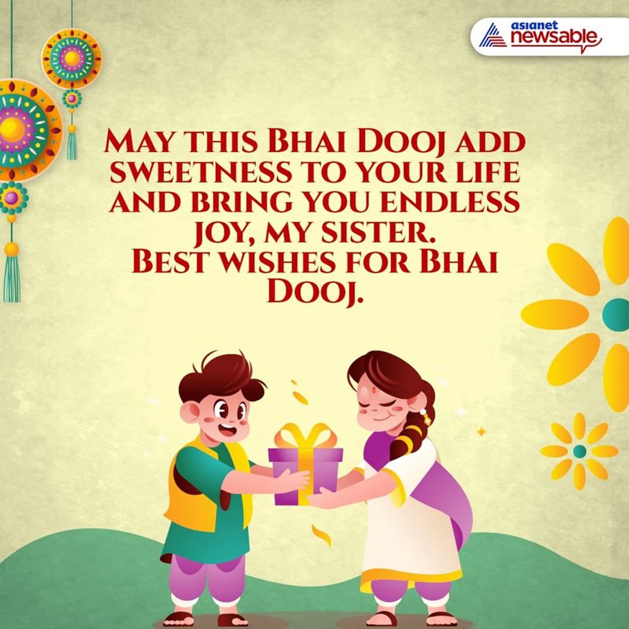 - May this Bhai Dooj add sweetness to your life and bring you endless joy, my sister. Best wishes for Bhai Dooj.