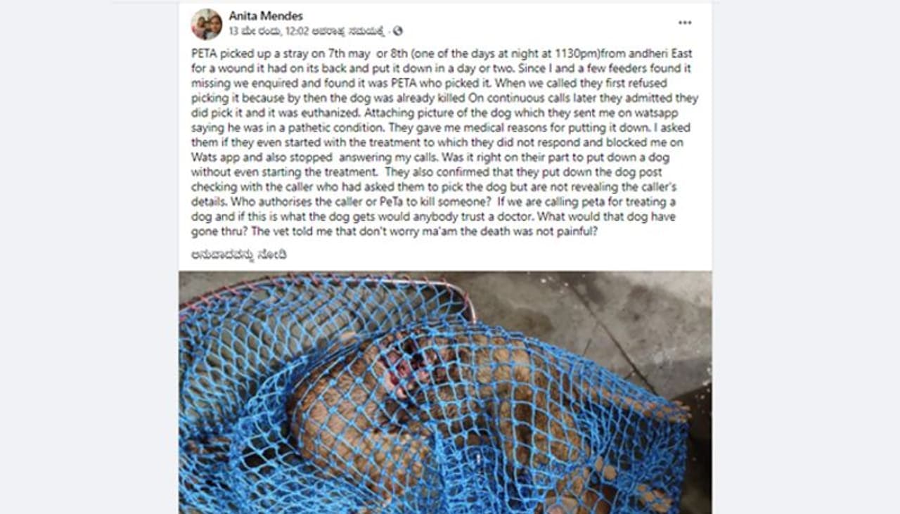 A few weeks ago, Anita Mendes, an animal lover and caregiver, took to her Facebook account to share her experience with PETA. She allegedly accused PETA that they have euthanised a dog in Andheri East, Mumbai, who didn't have a major injury.