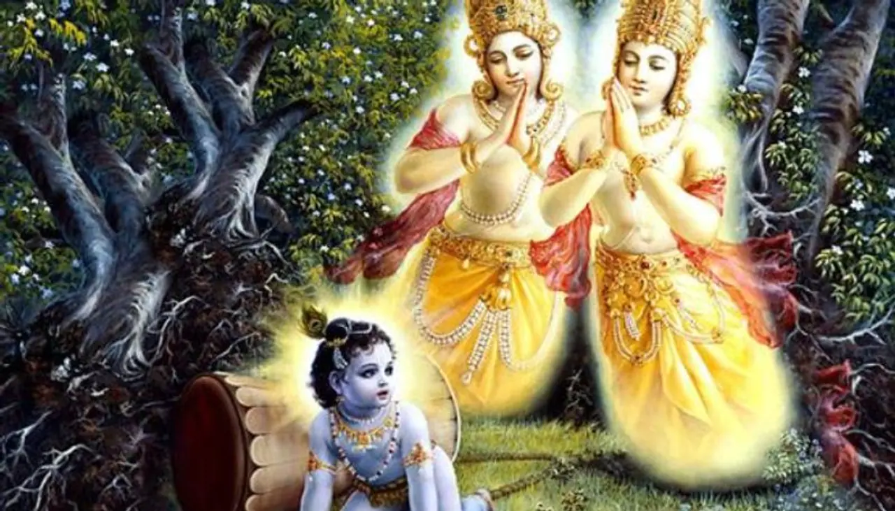 While giving Krishna her breast milk on Diwali Day, Mother Yasoda had to put Him down to tend to the boiling milk pan on the fire. When Krishna broke His mother's butter pots, He gave the contents to the monkeys as He was so unhappy. Mother Yashoda punished Krishna for his mischievous attitude by tying him with a rope to a sizable grinding mortar in the courtyard. The rope was too short by two fingers for her to tie around Krishna's waist. She tried again and again, adding more and more ropes, however, the ropes never got very long. Then, out of mercy for His tired Mother, Krishna consented to be bound. When Krishna was alone, he split two yamala-arjuna trees with a mortar, sending them tumbling to the ground. Narada Muni had cursed the sons of Kuber, Nalakuvera and Manigriva, who were imprisoned in these trees. They were now liberated.