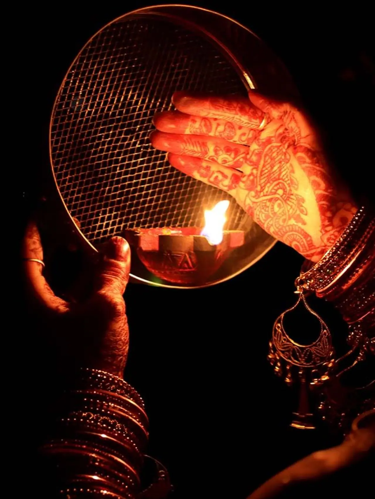 Married women give their husbands a full day of fasting, known as a Nirjala vrat (fasting without food or drink), and offer prayers for their long life, safety, and well-being on this day. From daybreak till moonrise, the women observe fast. Women celebrate the auspicious day by dressing traditionally, getting together, receiving presents, and getting their hands painted with henna. They break their fast by using a sieve to peek at their spouses' faces and the moon.