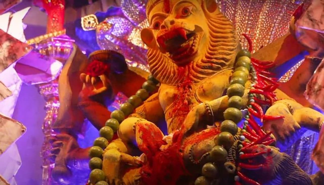 When Hiranyakashipu finally questioned his little son about the Lord's residence, Prahlada responded that the Lord is present everywhere. Hiranyakashipu smashed a pillar in his palace to mock this remark, and the Lord then manifested as His half-lion, half-man incarnation, Narasimha, from that broken pillar. He then defeated the demon, thereby defending His follower.