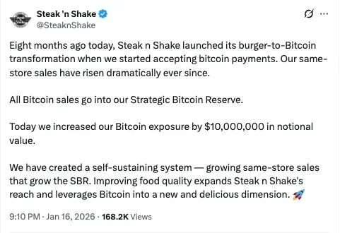 - The food chain reiterated that all Bitcoin payments go into its Strategic Bitcoin Reserve, after launching the reserve in late October.