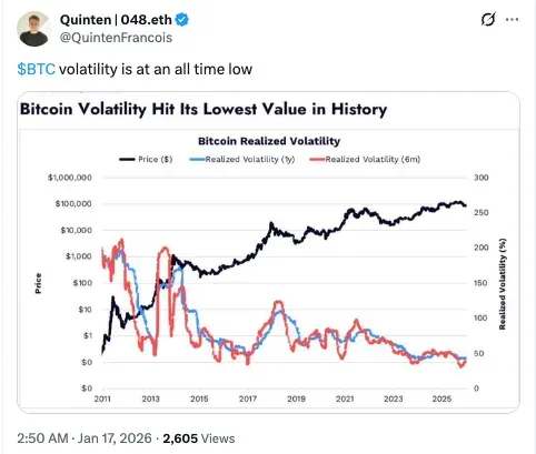 Bitcoin’s all-time low volatility could be attributed to Wall Street and institutional adoption and regulatory clarity from Washington, especially as the market anticipates the markup of the crypto-market structure bill.