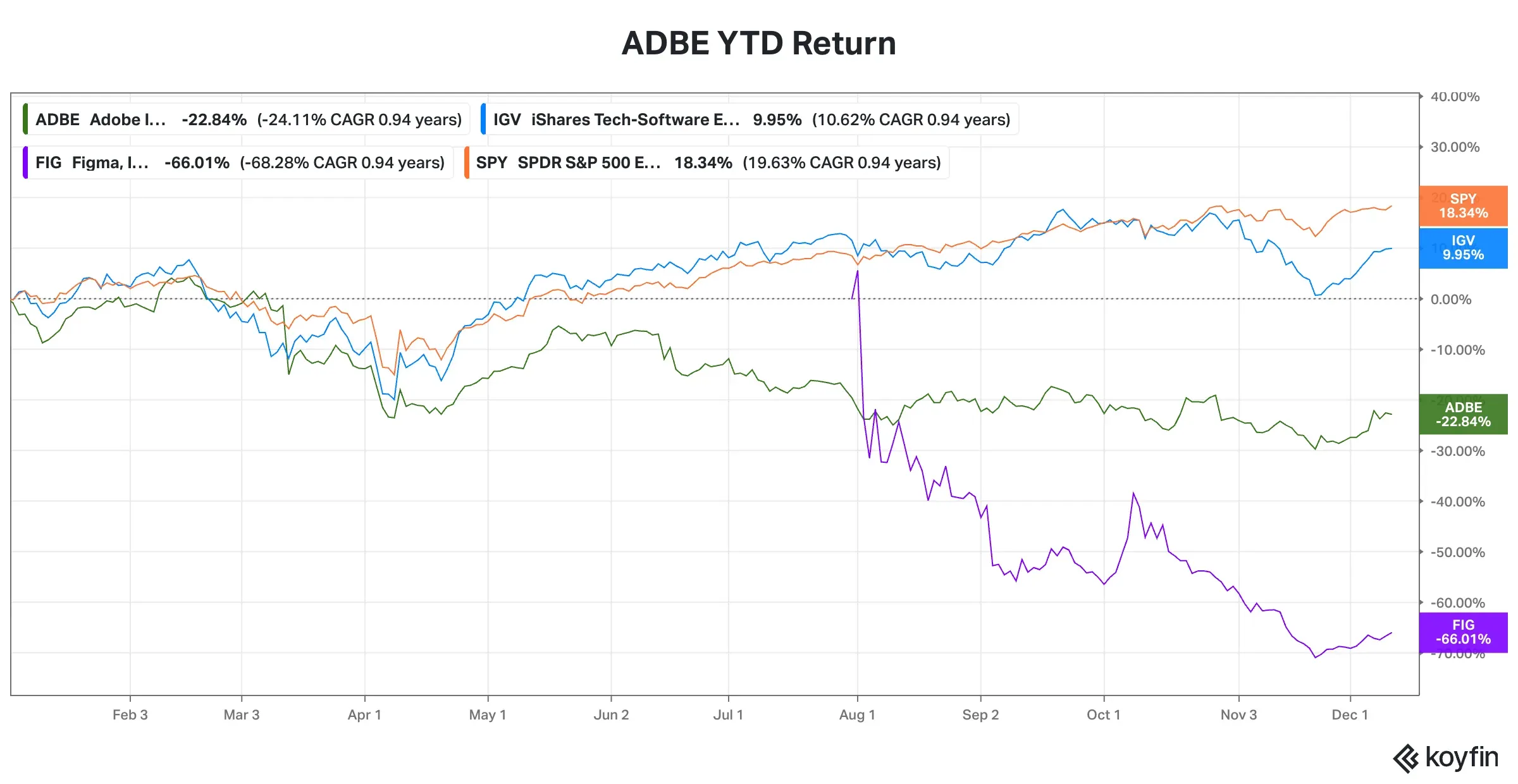 Adobe has generated negative stock returns this year, sliding over 22%, underperforming the broader market and the software industry. Its stock, however, did not fare as badly as that of smaller rival Figma, which had a stellar debut on Wall Street in late July, only to slump by more than 66% as the year heads to a close.