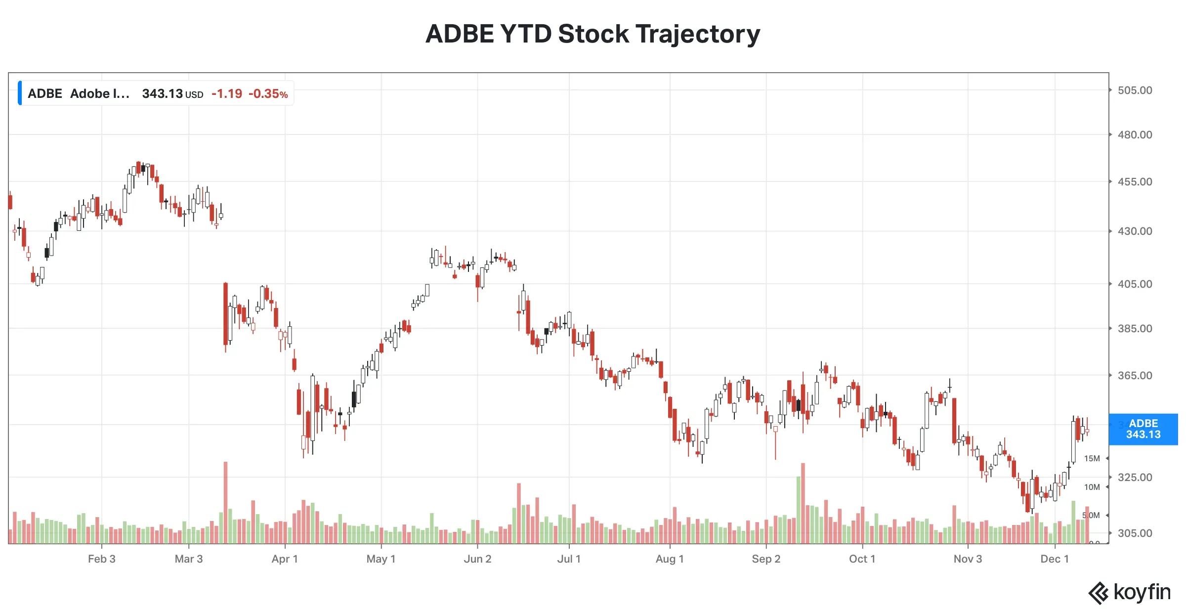 But most Wall Street firms hold a bullish stance on Adobe. According to Koying, 25 out of the 40 analysts covering the stock have either a ‘Buy’ or ‘Strong Buy’ rating. While 12 analysts remained on ‘Hold,’ three rated it as a ‘Sell.’ The average price target for the stock ($444.23) implies a 30% upside over the next year.