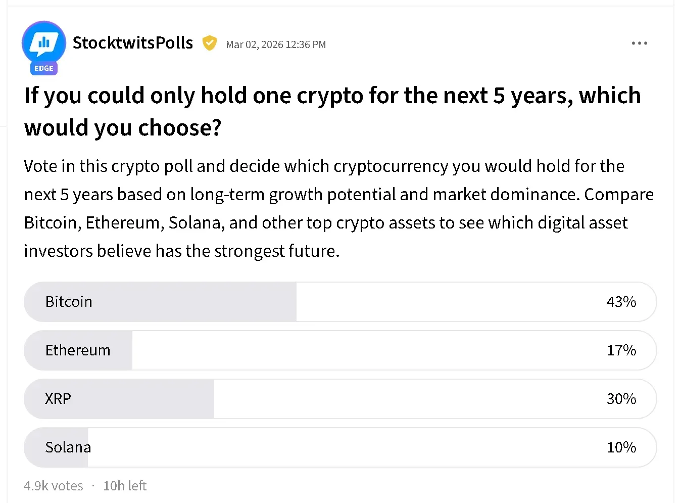 A Stocktwits poll found that 43% of respondents would choose Bitcoin as their preferred cryptocurrency to hold over the next five years.