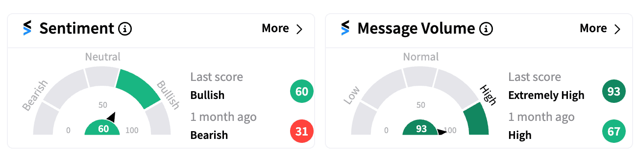 Retail sentiment on the stock has improved to ‘bullish’ (60/100) from bearish (31/100) a month ago. While message volumes have risen to ‘extremely high’ from ‘high.’