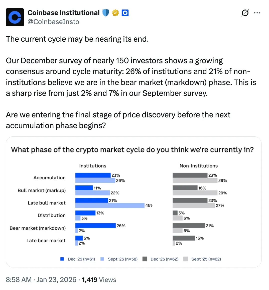 Coinbase said the results reflect a change in how respondents are categorizing the current stage of the cycle compared with earlier readings.