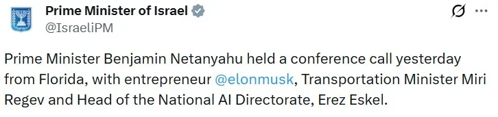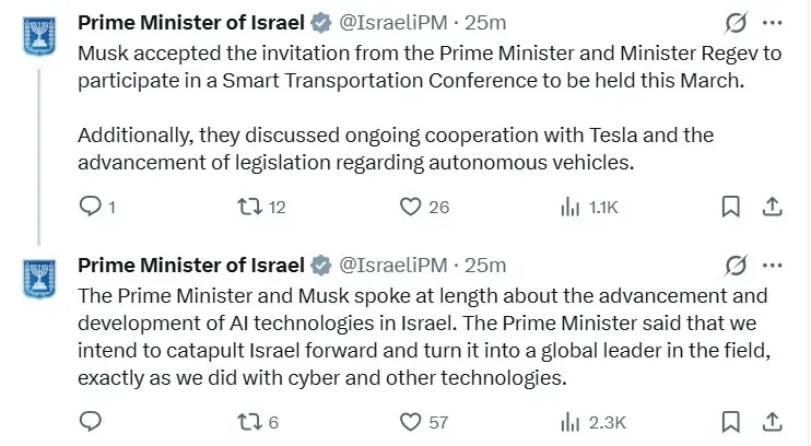 “The Prime Minister and Musk spoke at length about the advancement and development of AI technologies in Israel. The Prime Minister said that we intend to catapult Israel forward and turn it into a global leader in the field, exactly as we did with cyber and other technologies,” Netanyahu’s office said in another post on X.
