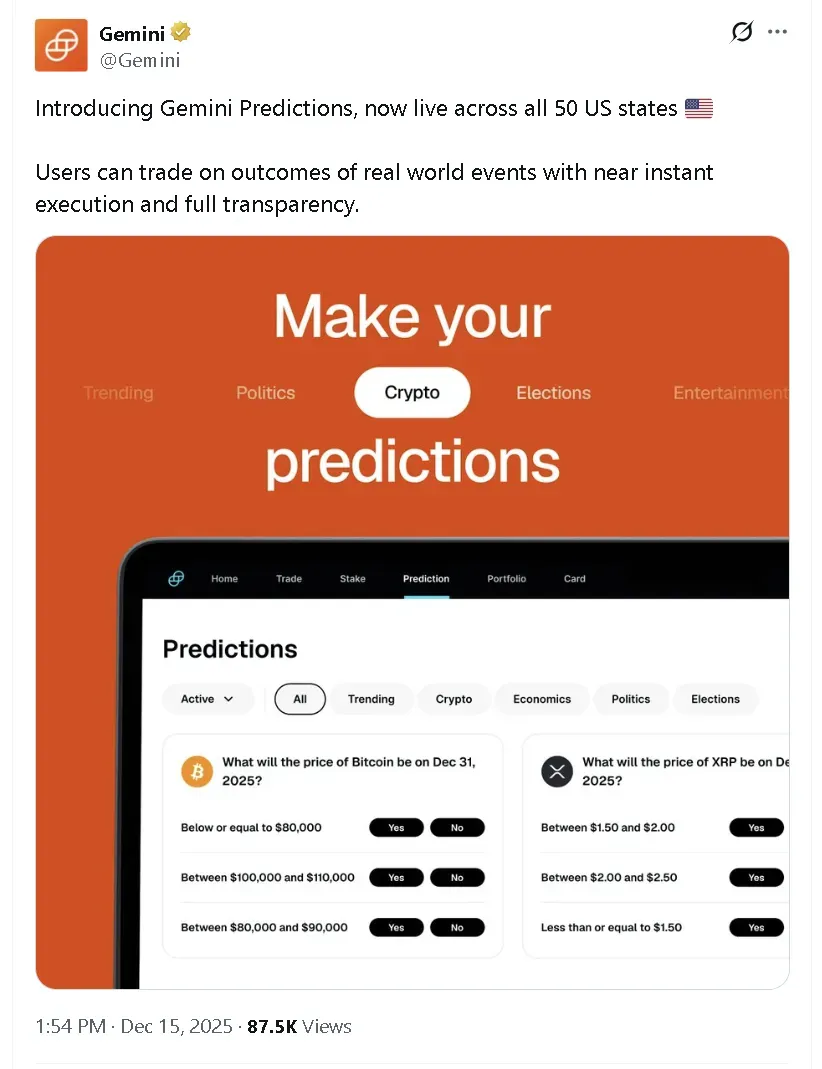 The crypto exchange, led by the Winklewoss twins, said it has launched ‘Gemini Predictions’ across all 50 U.S. states. For a limited period, the company will not charge fees on event-based trades, according to a post on X.