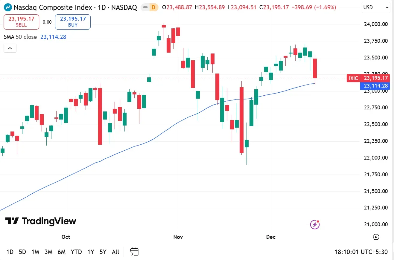 The Nasdaq Composite Index fell more than 1.7% to 23,195.17 on Friday, testing a key short-term support at the 50-day moving average (50-DMA) for the first time in nearly three weeks.