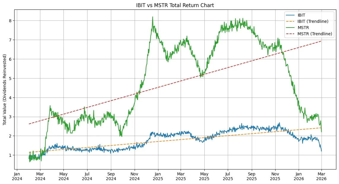 According to TotalReturns, when looking at total return charts comparing MSTR and IBIT, one can note that Strategy's stock has historically been much more volatile and has had a greater upside during Bitcoin (BTC) rallies. This is because Strategy is leveraged through corporate treasury strategy and debt financing. IBIT, on the other hand, is a spot ETF that tracks Bitcoin's price more closely. This gives investors direct exposure to the cryptocurrency with less extreme price changes. So far in 2026, IBIT has a negative return of over 18%, while MSTR has a negative return of over 8% year-to-date.