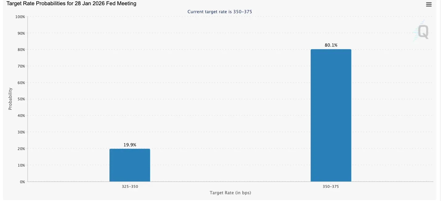 The CME FedWatch Tool now shows that futures traders have baked in an 80% probability of the central bank holding fire and a 20% probability of a quarter-point cut.