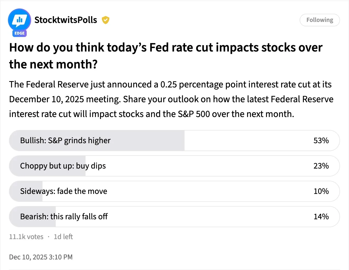 When Stocktwits users were asked in an ongoing poll about the impact of the December rate cut on the market, most were positive. To the question “How do you think today’s Fed rate cut impacts stocks over the next month?” 54% chose “Bullish: S&P grinds higher.” Twenty-two percent expected “choppy but up” market, and positioned themselves to ‘buy dips.”