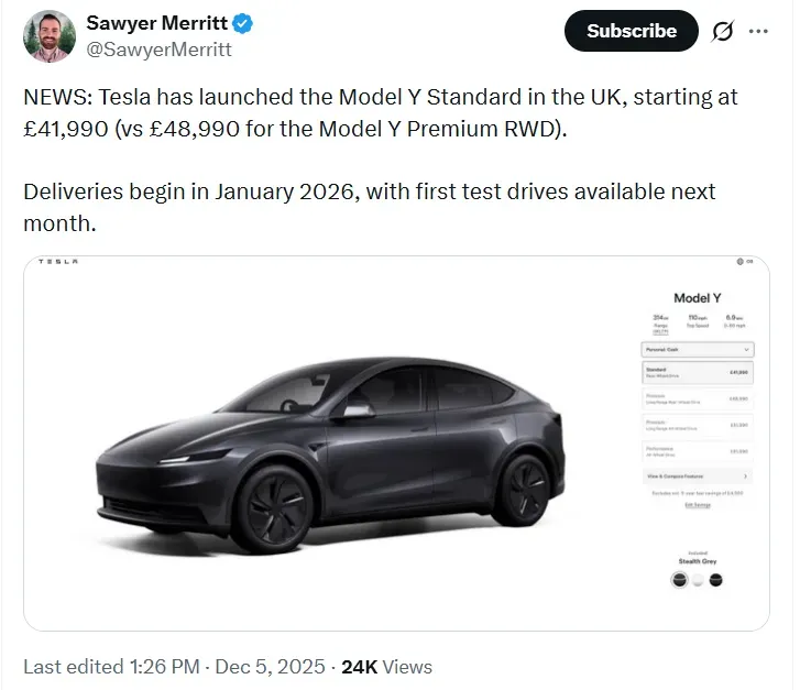 Separately, the automaker also launched the Model Y Standard in the UK, priced at £41,990. The launch follows Tesla’s rollout of a more affordable Model Y variant across Europe in October.
