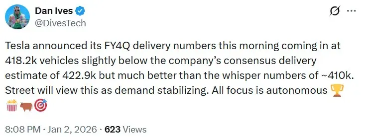 “Tesla announced its FY4Q delivery numbers this morning coming in at 418.2k vehicles slightly below the company’s consensus delivery estimate of 422.9k but much better than the whisper numbers of ~410k. Street will view this as demand stabilizing. All focus is autonomous,” he said in a post on X.